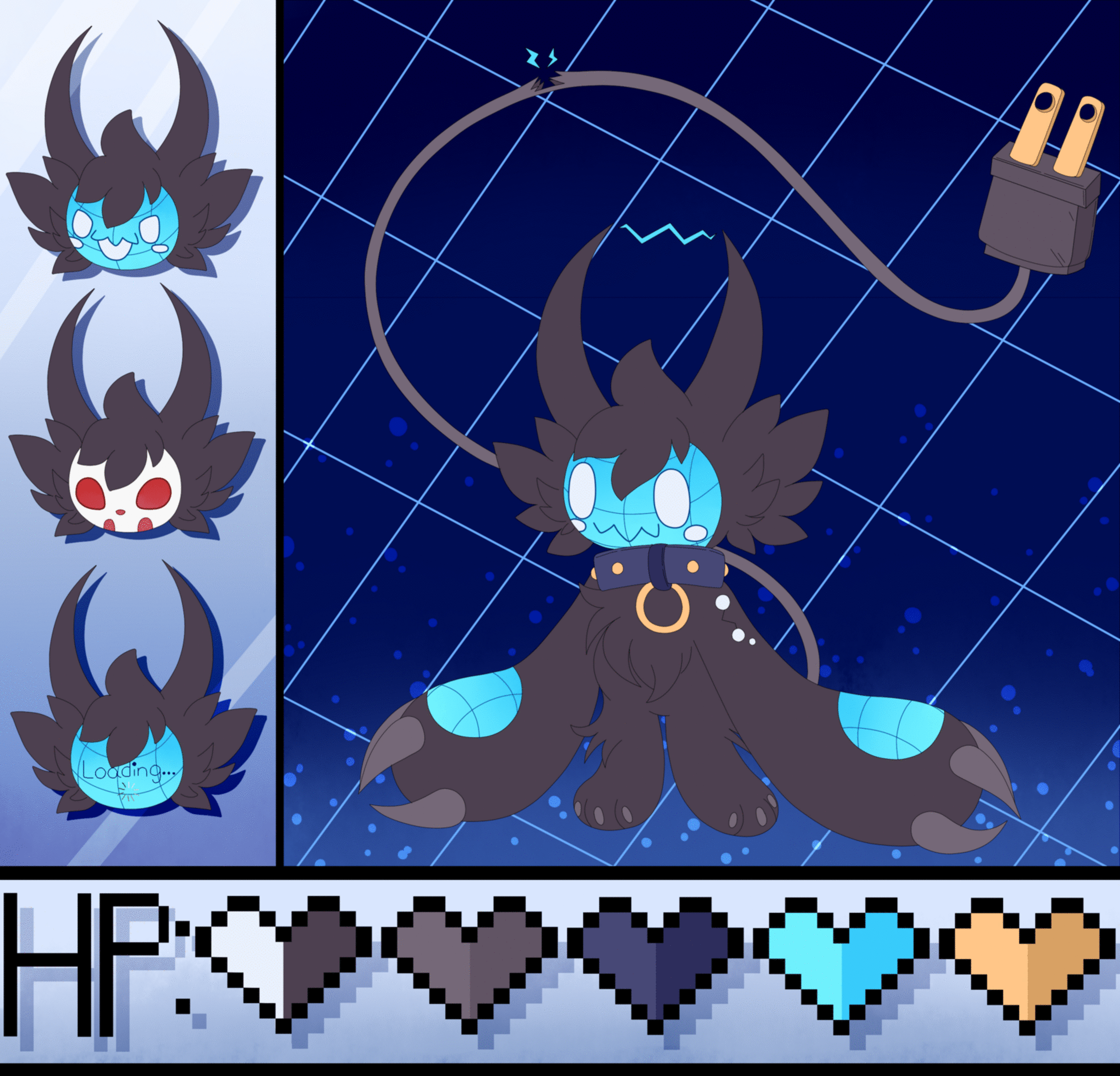 This is Pixel! Despite his looks, he's not a cyborg or robot! But he can store electricity in his body and use it, means that when he's tired he can "charge" instead of sleeping! Lmao