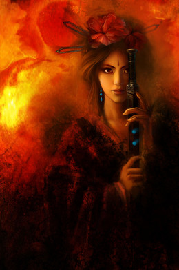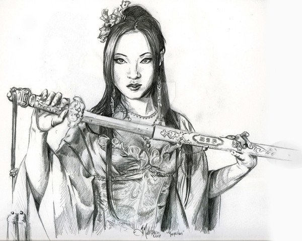 Wonderful painting and great concept. The details in this piece look fantastic, from the decorations on her dress to the rust on the sword, to out-of-focus cherry tree in the background. The girl herself looks sweet and gentle, yet strong and determined at the same time.