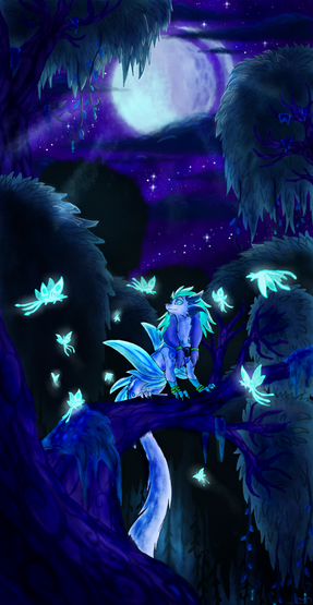 #blue #commission #dragon #fireflies #forest #moon #night #raptor #sky #stars #trees #water #siranor
