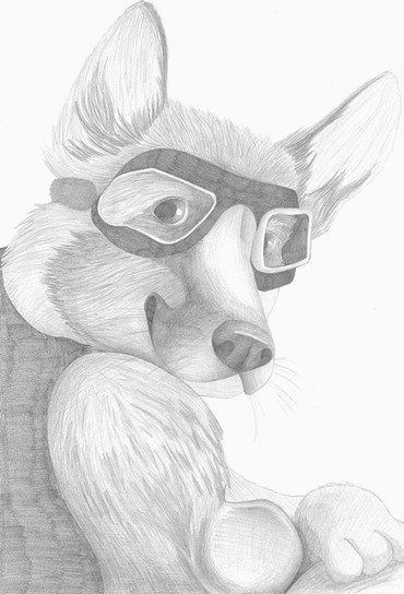 In this drawing we see him just being happy though like any pup should be, playing with his stuffed toys.