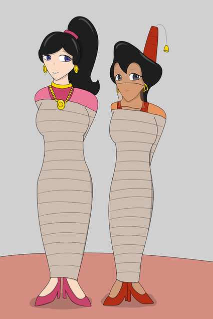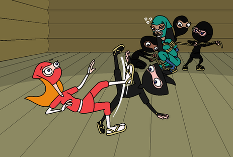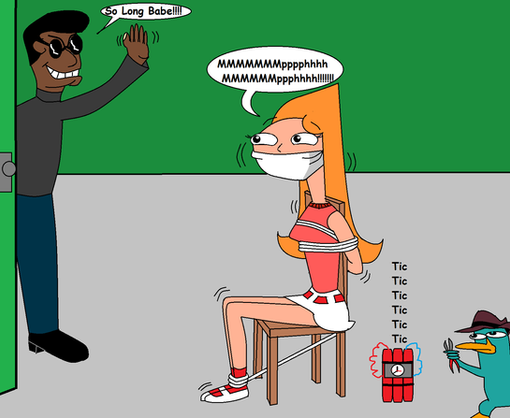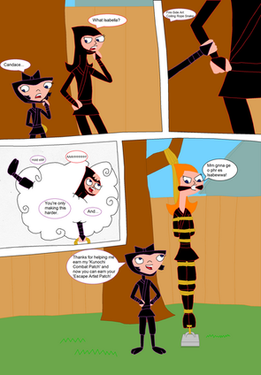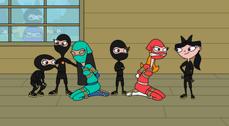The idea here is that Candace is mad at Isabella for tying up her friend Stacey while Mandy is mad at Candace for tying her up, while Candace's cousin Elizabeth is just confused about what these crazy Americans are doing. Meanwhile little Suzy is trying to kick an apple at Candace and is using Linda as a stand for the apple. As to why they're all dressed as ninjas and tying each other up; beats me Danville's a weird place.