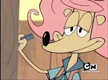 A Cartoon Network show:Patsy is an adventurous, skillful and upbeat mongoose with pink hair. She has a crush on Lazlo, and throughout the series she tries to impress him, like when she pushed him off a giant pine cone with her love, lied about being a snake-hunter, and gave him a valentine card. She is Commander Hoo-Ha's daughter, which is weird since she's a mongoose. In an interview Murray said that Patsy's affection causes Lazlo to feel "little freaked out" and that "She scares him." He describes Patsy as "a little more aggressive with Lazlo than he would ever reciprocate". Even though her affection causes Lazlo to feel uncomfortable, Lazlo probably has a secret crush on her." In "Spacemates", it's revealed that Patsy and Lazlo are soulmates, meaning they will be together in the future. Voiced by Jodi Benson, she is the prettiest of all the Squirrel Scouts.