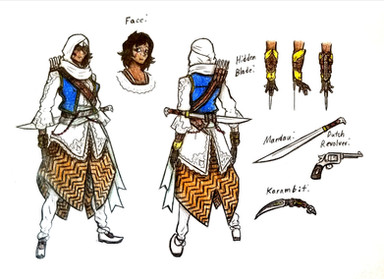Bio: Apsarini was born in the middle of a dirty Batavia slum to two Assassin parents who were descended from Arab immigrants. She never got a chance to know these parents, however, as they were brutally murdered by Templars when she was barely a year old. She was left to be raised by her older brother, Jaga, who grew quite overprotective after the loss of their parents. Apsarini grew up watching the politics of her homeland get bent and warped with Dutch intervention, and always swore to free the islands from their colonial regime. Her fellow Assassins were not as eager as she was however, because they were still desperately trying to recover from the purge led by the Templars after the VOC was dissolved in 1800 and the Dutch East Indies was formed in 1816. Many of the Indonesian Assassins were paranoid of stepping out of the shadows, including Apsarini’s brother, and it often led to some serious arguments between her and the Brotherhood.