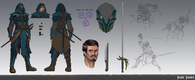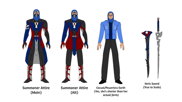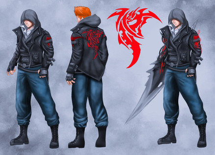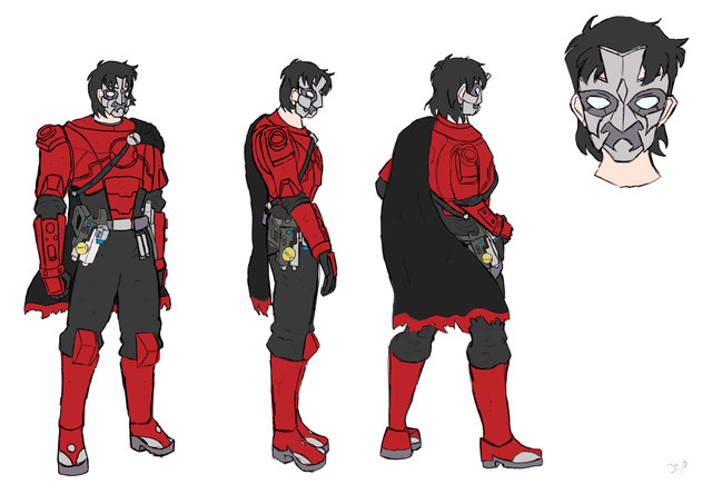 Design notes, Brandon I hope you appreciate that all of your OCs have the most uncooperative color schemes you could've possibly chosen. My scanner really doesn't like black outfits, and it's extremely difficult to preserve accents of other colors on a mostly black background. I'm getting this off my chest now because it's gonna be a recurring theme. Anyways, the basic premise Brandon's given me in the past for this design is black leather jacket, and gray hoodie with blue accents. Simple enough, and in the past I've kept it similarly simple. For this one though, I wanted to extrude more of that classic eagle-esk silhouette that Assassins are famous for, and I really like how it turned out. As much as I just complained about my scanner, it actually picked up on all the details pretty damn well in this instance. The hoodie, not so much. For the most part it worked, but there's a darker blue lining under the hood which is meant to form a third beak in between the two light blue ones, like Aquilus's hood. You can kinda see it if you squint really hard and you know what you're looking for, and at the very least it doesn't take away from the overall design if you can't. On the weapons side, I actually recycled the baton from the hilt of an Assassin lightsaber I sketched out once XD It's meant to resemble the Sword of Altaïr with a more sci-fi vibe, and I think it works really well in this context too, but now I'm just patting myself on the back and I'm not the one whose birthday it is. Everyone go harass Brandon instead.