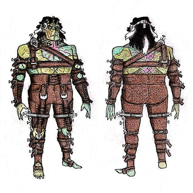Design notes, like purple, brown is one of my colored pencils that my camera just doesn't seem to like :') Apologies if the lineart doesn't come through particularly clear. His jacket is thick leather, with a snakeskin texture across most of it. I very much tried to go for a humanized viper sort of vibe. He's got a thin chain necklace and chain ornaments hanging off his belt. In addition to the tattoo of a stitch line across his throat, he also has an identical one on the back of his neck, though obviously it's hidden by his hair and collar in the drawing. The mark on his forehead is actually not a tattoo, it's meant to be a bullet hole scar. Don't ask me how he survived getting shot in the forehead. I created the man and even I don't have an explanation yet. I just thought it looked cool and ominous.