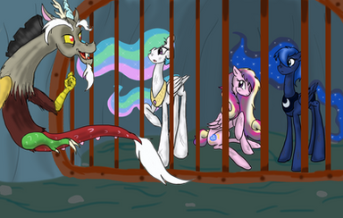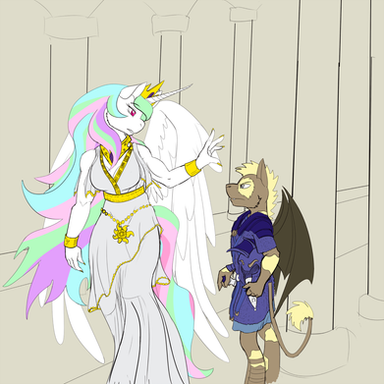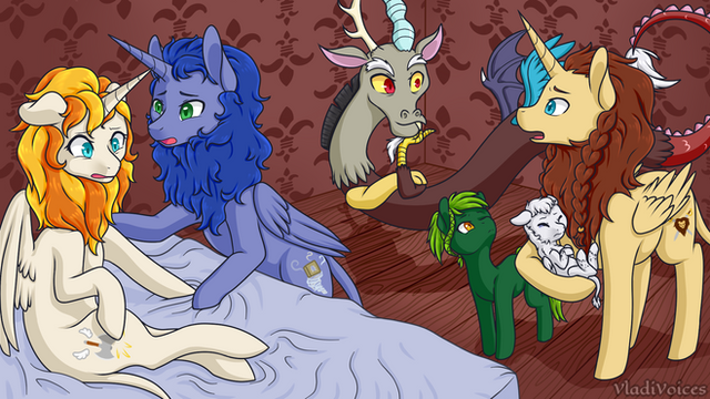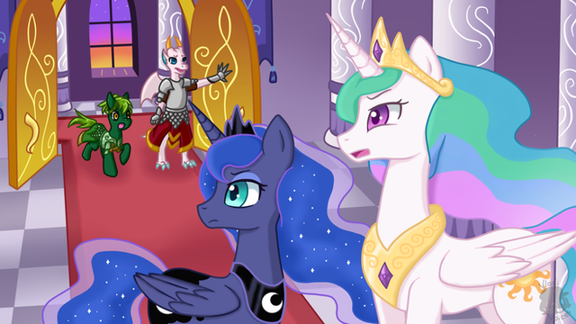 Discord crashed a wedding, because he was annoyed that no one invited him, and decided to cause some chaos between the three ponies that hadn't already fallen asleep: Matrimonium, Amare, and Sapientia. He showed them an Apple that he stole and offered to give it to whichever mare was the fairest. Matrimonium and Amare fell into his scheme, the former wanting it for potential political power and the latter wanting it because she's full of herself and feels like she deserves it just because. Sapientia however, wasn't willing to fall for Discord's tricks. She just played along in hopes of getting the Apple out of his hands before he did something awful with it. She just hoped that she wouldn't have to fight too hard with the others to do so.Related content