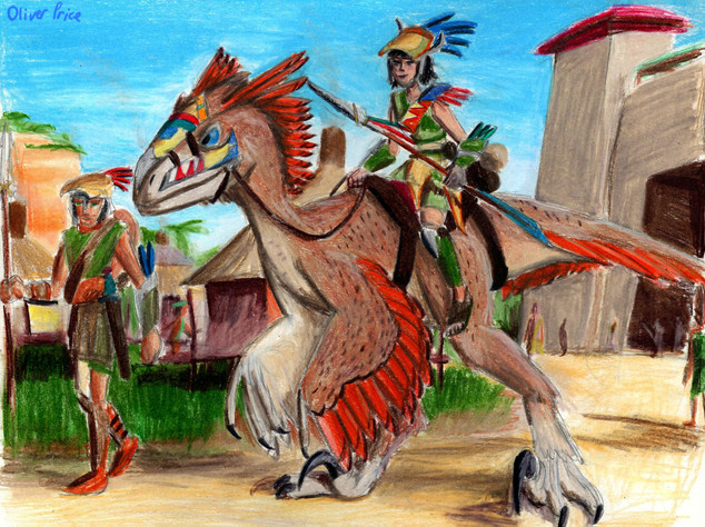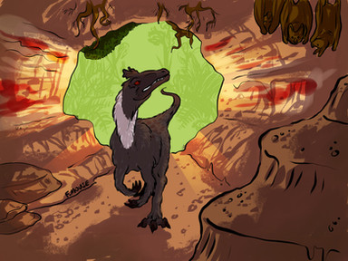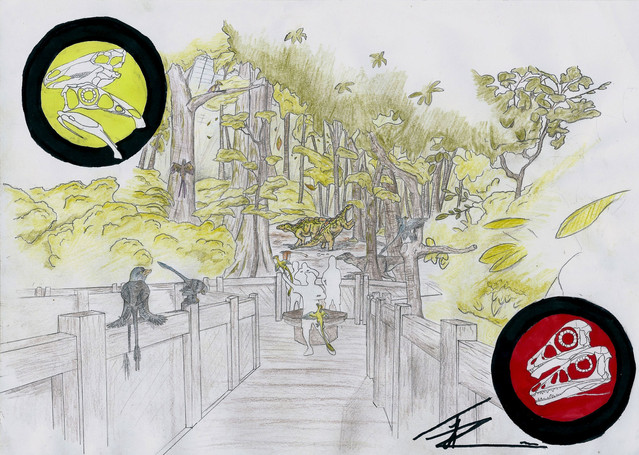 I like the idea that you have put the dinosaurs in the foreground and I also like the idea that you have added feathers to them (I can remember that I have read an article that dinosaurs had feathers and not scales )