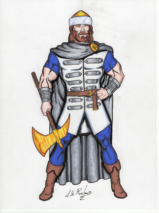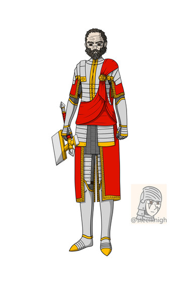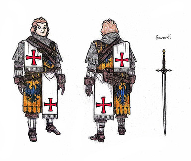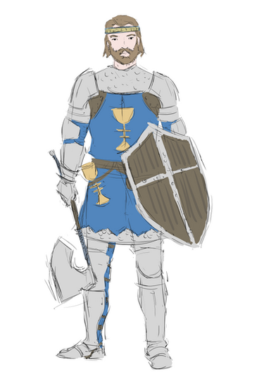 Design notes, this one was pretty straight forward. I could only find two historical depictions of the man out there. The more famous one is a 1841 portrait by Henri Lehmann, whose name sounds like some sort of French NPC. The other is a statue carved into a monument dedicated to Saint Bernard in Dijon, France. They're both relatively simple images, but combining them together sort of makes up for it. Not nearly as complicated a design as if I was designing the final boss of an Assassin's Creed story, but that wasn't really what I was aiming for anyway. I actually quite like how he came out. I think I might have laid on his limb armor a little too thick, but other than that, not much to complain about. I am really damn proud of that sword. I'd love to loot that shit in a D&D game. Hol' up, let me note that down real quick-