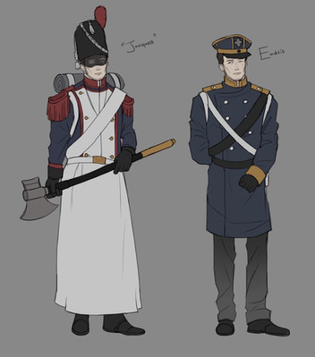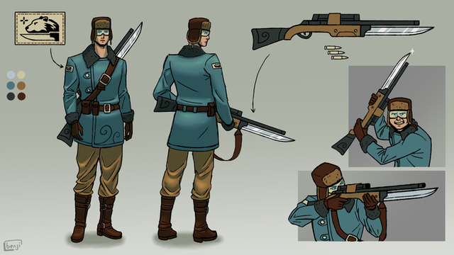 Design notes, so Brandon's original prompt for this character was pretty much just Union Army sergeant uniform with a hood slapped on top. Alright I can roll with that. Y’all know I love the Civil War. My most romanticized time period isn't knights in shining armor, it's generals in blue. Therefore I really wanted to clean up Jackson more than any of the rest, make him a prim and proper officer with nice ironed robes and shiny white gloves. I kept the layering kinda simple, but I think that works to its advantage with this character. His rifle was especially in need of an upgrade. Like shit I didn't even try on the old reference sheet, apparently. I'm getting a lot better with firearms with more practice, and as I've said before I'm not a big gun gal, but damn that thing came out sexy. Now there's a girl that can tell traitor hicks exactly which hole they can shove it up.