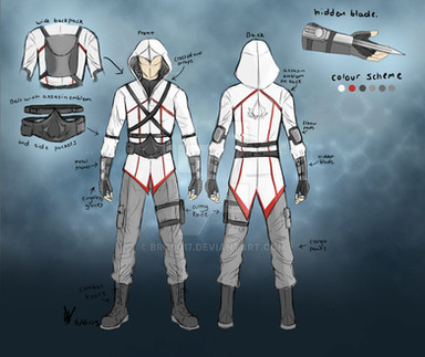 A reference sheet for the OC of my good friend and co-writer of “Nothing Less”’s modern day storyline, . This OC actually was not originally an AC character; we had to adapt him to fit into the rules and lore of the series. And I'd say we did a decent job