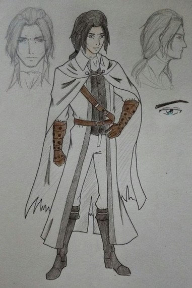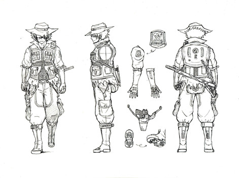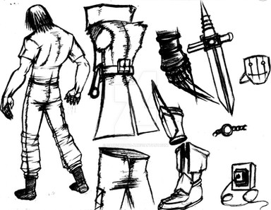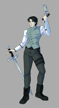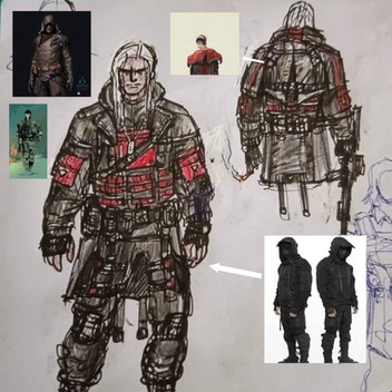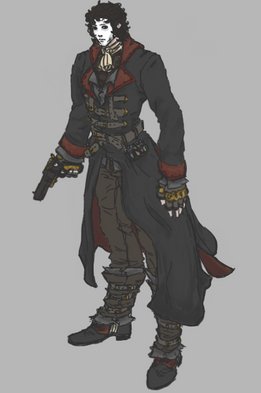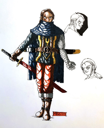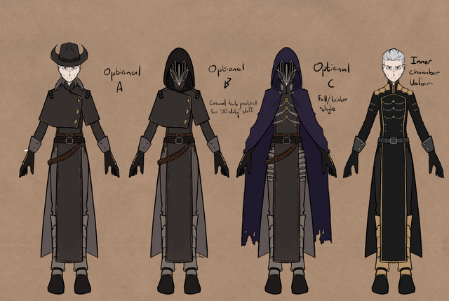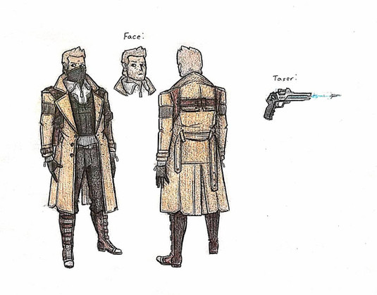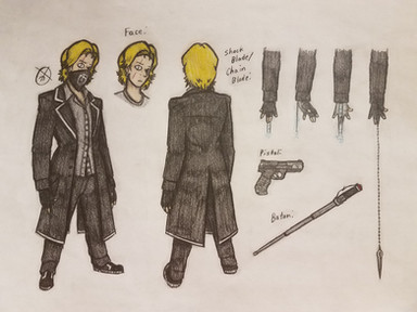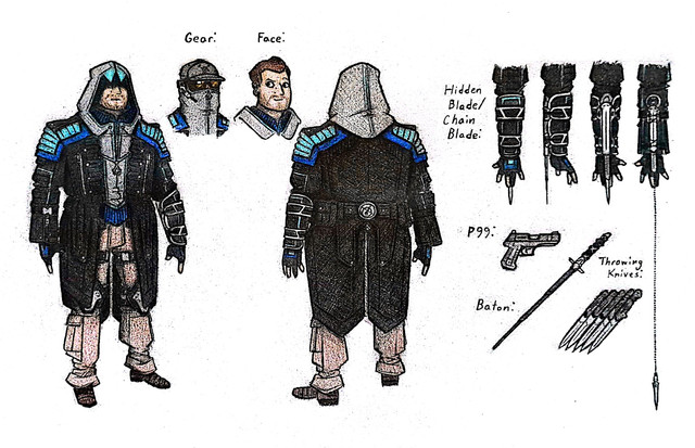 Part two of milking my friend famous YouTuber Blobbygobster ’s birthday for content is his secondary OC, Jason Feldew. Born in 1981, Jason had been a member of the Assassin Brotherhood since at least 1998, when they had him hooked up to an Animus reliving the memories of his ancestor, Jackson McCride. The Bleeding Effect from these sessions eventually landed Jason up sharing a head with the isu Neptune, who convinced Jason to bounce during a Templar attack and search for his Piece of Eden, the Trident, on his own. Jason's old mentor Thomas reunited with him in 2001, and while he was unable to persuade his old teammate to come back to the Brotherhood, the two did agree they'd at least remain allies against the Templar Order. That was all well and good until 2009, when a piece of the Trident of Eden was found and Jason's runaway Bleeding Effect led to the murder of one of the Assassins on the team. As a result, Jason went on the run for the better part of a decade, until the Assassin Brandon Johnson caught up with him. Luckily, Jason was able to persuade Brandon to call a truce in order to investigate the lives of their shared ancestors along the McCride line for more pieces to the Trident. Where that truce has led them remains off the record…Design notes, this one turned out way better than I expected it to. The original prompt for Jason's design was black trench coat with white accents, iconic mask, and eye missing from a Templar assault. Fairly simple, not my style. Whenever I do modern designs, I like to try to take as much inspiration from cultural background as possible. For Jason, that meant Irish, so the primary aesthetic I ended up going for was… IRA XD with just a smidge of the ronin antihero Brandon denies Jason is. I even based his baton off of historical Celtic sword hilts. The black also came out surprisingly clean in my scanner, which is more than I can say for the next one but uuuuuggghh we'll get to that when we get to that. Why can't you just stick to the classic white robes like the rest of us Assassins, Brandon?