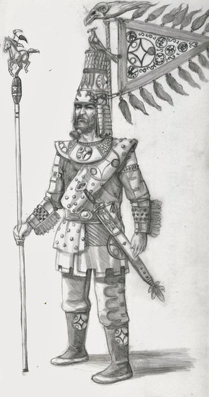 Kshatra Vairya probably has the least information about him available online out of all the six (sometimes seven) Zoroastrian entities known as the Amesha Spentas. Apologies if this entry is a little short, as a result. If anyone has any scholarly sources on this being, I'd be happy to read them. Simply put, Kshatra Vairya is the embodiment of divine strength, and represents the immense power that righteousness ultimately carries over evil in the eternal struggle. His name literally means "Desirable Dominion", which definitely needs to be a metal band name. Speaking of metal, later tradition would associate Kshatra Vairya with the element of metal, as metal is the material of weapons and war, which draws blood and vanquishes foes into forgotten obscurity.Design notes, based on this association, I leaned heavy into decking this guy out with resplendent brass and sleek armor. Admittedly, I based his chest armor more off of Sassanid era armor, so it may not be entirely accurate to his original Achaemenid context, but it looks really cool so I'm willing to let it slide. There's a few ancient coins minted with depictions of Kshatra Vairya, so I had a very rough silhouette to draw from. You're probably noticing a pattern here where the ancient Iranian kings only minted their image in association with the male Amesha Spentas and the powers they bestow. The patriarchy strikes again-