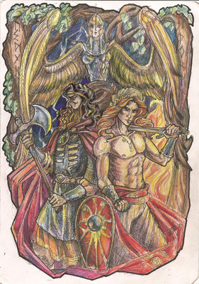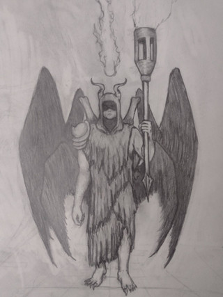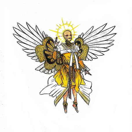 Design notes, there are shockingly few depictions of Metatron out there, at least that I could definitively identify as Metatron. I try my best to not just pull up Google Images and draw whatever first comes up when you just type a word in. I dig a little deeper and try to trace the images to their source because often people will just slap a generic looking art piece on an article and call it whatever they're talking about. Angels are really bad in this regard. You can throw up practically any image of a dude with wings and say it's an "ancient depiction of [insert angel name here]." But when you trace the icons they're either actually a completely different figure and/or about as ancient as Back to the Future. I only found one blurry image of a church icon depicting Metatron as this gold winged angel with black body feathers, but I couldn't find the specific church it was from or the confirmed name of the angel being depicted. But it didn't have any other providence so that's what I leaned into, though I only took slight inspiration from it.