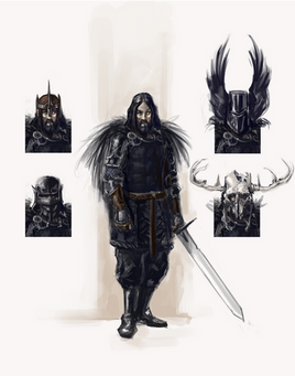 Design notes… uuuuuuuUUUUUUGGGHHH *slams. head. into. desk* Why did I envision this punk as an emo little twerp? I made things so damn difficult on myself. My scanner does not get along well with large swaths of the color black. Racist bastard. I wanted to combine the whole black knight aesthetic he's often given in historical images with the raven schick of the Morrígan (whom I've decided to conflate with Morgan le Fay for Drake Hero, more on that when I post Morgan's sheet). I wrangled it in eventually, but man I had to digitally edit this so much. The base is primarily a combination of N.C Wyeth's illustrations for the 1922 edition of "The Boys' King Arthur", a 1902 illustration by Henry Justice Ford, "Sir Mordred the Traitor", drawn by Howard Pyle in 1910, and the costume from a 1895 stage play performed at Lyceum Theatre in London. His helmet is my own design, pretty much just combining a Roman helmet with a raven-esque porcelain mask. Clarent was also of my own design, inspired by raven iconography found in various Celtic and Nordic archaeological contexts, and combining them with a Roman spatha. I very much wanted it to be a dark reflection of Excalibur, and go whole hog on the whole "evil bad guy" aesthetic. I want Drake Hero's Mordred to be an edgelord who drips with sass and takes five hours to decide his outfit every morning.