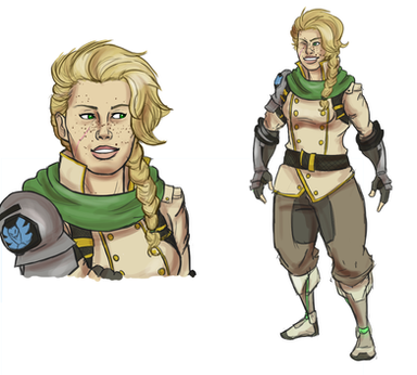 Her tattoo was a pain in the ass to design. The premise was simple enough: a simplified model of a DNA molecule. In practice though, it was a nightmare to break down because hey turns out DNA is complicated, who knew. Eventually though I got it down, following the most basic shapes formed by the molecular diagram of DNA, leaving out all the letters except for the "O"s of oxygen so that it still looks like a molecule instead of just lines. I think it looks neat, a nice blend of biology with something that looks more technical, just like Patch. And of course "GraC++" on the back of her shirt is a nod to my other OC, Grace, for no particular reason other than I needed something to fill the space in the composition. I've since made that her username in all the story notes I've written for Patch, so there's something to it at least.
