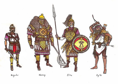 Design notes, this one was relatively straight forward. Not only are Roman military uniforms widely documented, but the Romans were also the first to really standardize their military equipment. It's fairly easy to find all manner of consistent references for everything from legionnaires to centurions. Hell, I took Latin in high school and my teacher had a mannequin dressed in a full suit of lorica segmentata, which he would don for presentations because Mr. Perkins was awesome. He also had a gladius and a pilum which he once allowed us to hold. Stupidly, he allowed the pilum to enter my clumsy hands, and I nearly took my friend's head off when I spun around to look at someone who called my name. Don't give me pointy things. Anyways, the only one I really took the most artistic liberties on was the heavy. I sort of combined the get up of an aquilifer (standard-bearer) with the armor of a gladiator. Initially I was kind of against using gladiators as a reference, since gladiator combat was staged and embellished to such a degree that it really shouldn't reflect Roman military customs, but I can't deny they lend themselves well to that hulking barbarian look I wanted to fulfill. That's barbarian in the modern sense, not the Roman sense. I think I'd have my scrawny ass beat in the street if I called a Roman a barbarian from their perspective.