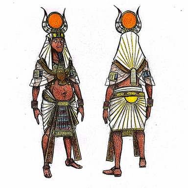 Design notes, this was simultaneously one of the easiest and most difficult Pharaohs to design. On the one hand, Tutankhamun was buried with all his shit, so I could just draw directly based on real articles of clothing from his wardrobe. On the other hand, his wardrobe was quite extensive, and many of the textiles have rotted away over time, so I primarily had to rely on reconstructions. Nonetheless, everything you see in this depiction is based on something found in his tomb. I couldn't include everything, that would just be too much, but I did my best to select the items which I think cut the most dashing figure when combined. It is worth noting that many of the clothes found in the tomb are clearly uniforms he would've worn for different occasions at different ages, so I did my best to narrow it down to a generic get up. He also had multiple bows and multiple shields, and I'll be real with y'all, I just went with the ones I thought looked the coolest. Hey, I bet the kid would've had the same standards.