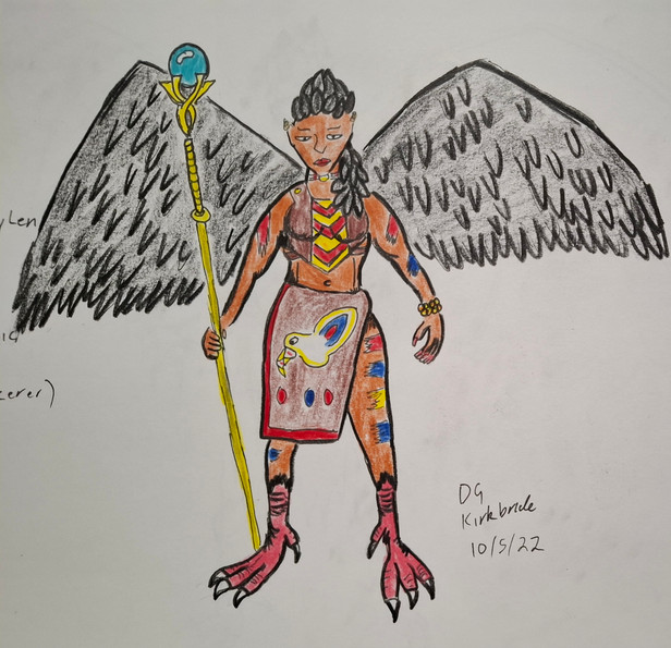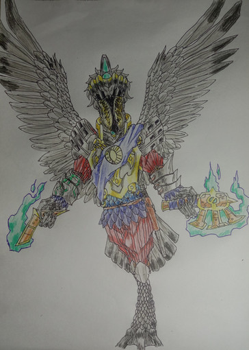 Design notes, like Asha Vahishta, there are a few coins from ancient Persia depicting this particular Amesha Spenta. Being coins, they often aren't particularly detailed, but it does at least give me a historically viable silhouette to extrapolate from. For his wings and tail, I took reference from a bird known as the oxpecker, an animal which forms a symbiotic relationship with large hoofed mammals by picking parasites off their hides. The reason behind the choice is fairly obvious, I hope. Speaking of oxen, I strapped a cattle yoke over his torso, which was a bit of a pain in the ass to design for a bipedal form but I think I got it to work. I also fitted him with a pair of falconer's gloves, a sign that he is completely comfortable handling and respecting the power of such noble animals. I also modeled his beard off of a goat's, because what animal has a more majestic beard than those dopey little mad lads? Well okay I guess the bearded vulture has some wicked ass facial features, but I'll save that for the next one.