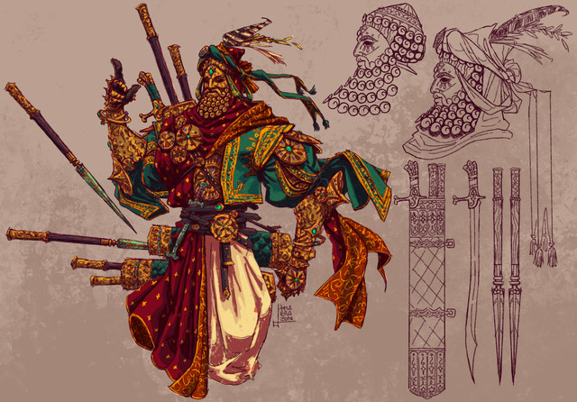 Design notes, I'm not entirely sure I'm happy with this one, but I can't quite put my finger on why. I took inspiration primarily from a 19th century depiction of Zerubbabel and Joshua conversing with the prophet Haggai by Jan Reckleben, and a couple of stained glass portraits which I wasn't able to trace what church they came from, sadly. I'm fine with his robes and scale mail, they look sufficiently accurate for the time period and culture. I think it's just my decision to include the limb armor and crown. I don't think they'd be too out of place in Persian Jerusalem, and I tried to make the crown appear more turban-like, but they do really straddle the medieval style, don't they? His sword is also pretty fantastical, and I think the original design in the stained glass windows were trying to emulate a vague "Middle-Eastern-ness", which normally I try to avoid. But I'll be damned if it doesn't look really cool, and hey sometimes that's enough for me to suspend my disbelief. That is exactly the kind of sword I would hope to loot out of some kind of desert dungeon.