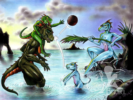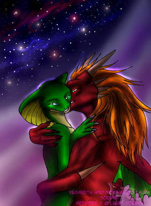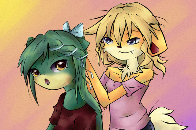 No naughty parts present so i don't put a warning here.Hehe this is actually my most recent piece. There is nothing better than looking at two beauties having a nice time relaxing together. My part of a trade i have with Mona. The thing is she said both our girls looked similar in a certain way, both green reptiles with blond hair and related to water. I had a bit of a hard time trying to come out with a subject, but i finally did, Cela placing flowers on Mona's hair. Cela always loves to add her garden works to everything. I had a horrible time trying to make Cela's face look ok, i redid it more than 7 times, i just loved how Mona's ended up looking.