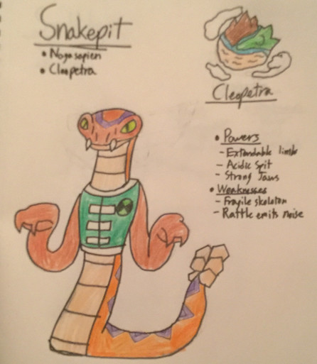 Description: Snakepit is a snake-like alien with a cobra-like head and hands that resemble eyeless snakes. When he speaks, he tends to hiss. The Ultimatrix symbol is on his chest.