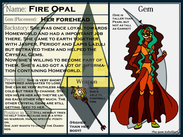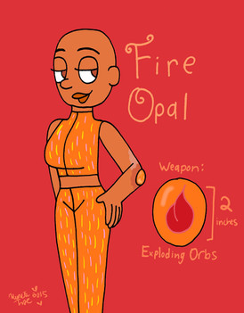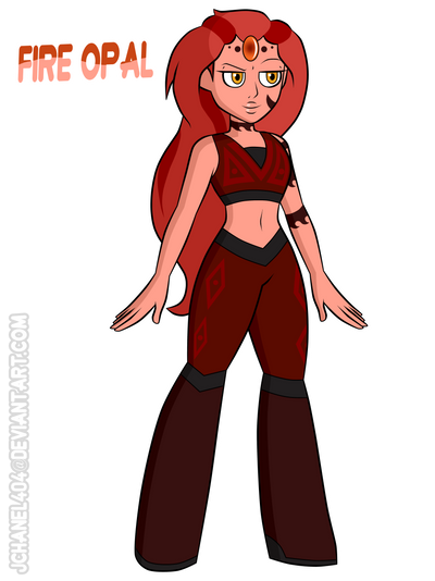 FeaturesAs with all Gems born of Hyperion, Fire Opal’s form is unique. Despite being a single gem being, she holds the power and size equal to most fusions. As with fusions, she naturally bears an extra set of arms, a feature that most likely aided in her mastery of pyrokinesis.