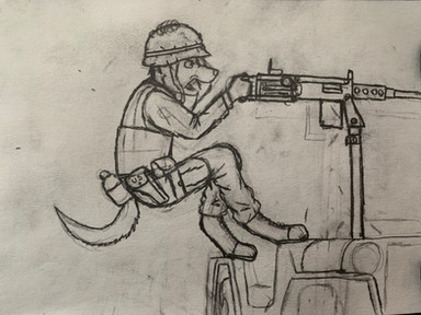 Here’s an unfinished sketch I made of my arms dealer character Kurt.The Captain can trust him, he’s a trustworthy guy! They’re just crates full of... Teddy bears... totally not missiles or something...