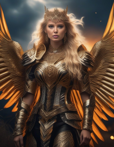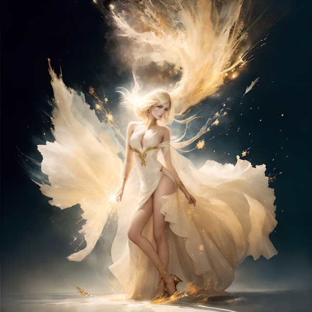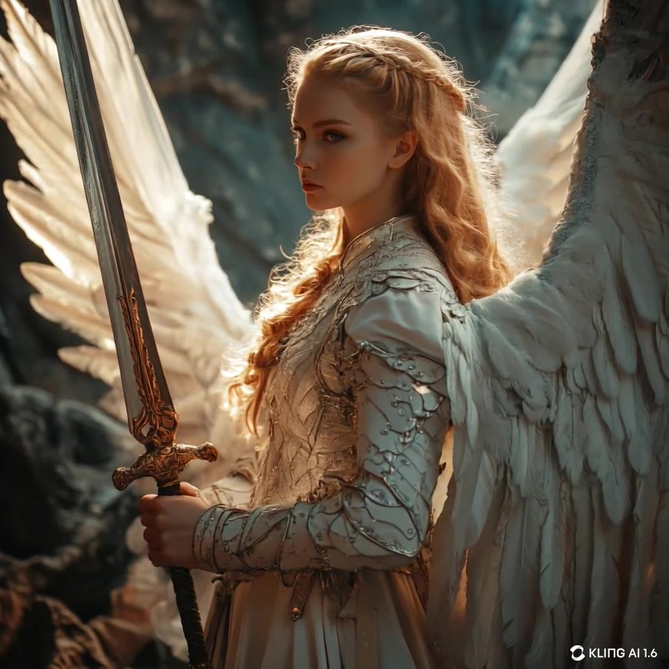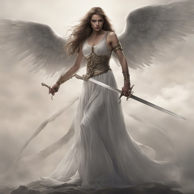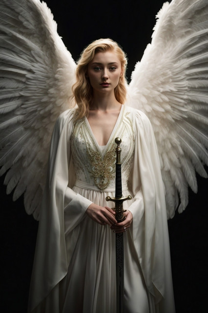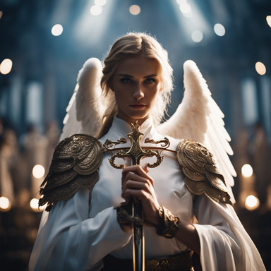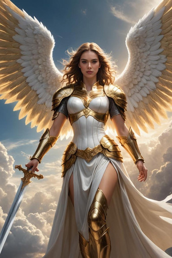 Prompt: Cinematic shot of a woman in a white dress with wings and holding a sword, in the style of the movie "Troy", dark azure and gold, professional lighting, shot with a hasselblad h6d - 400cRelated content