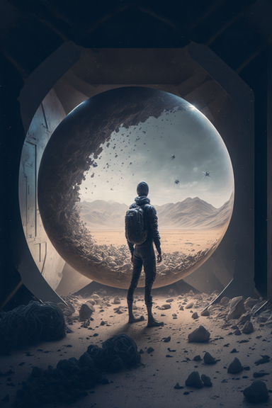 Prompt: High detailed wide back shot of a woman in a futuristic space suit standing at the open door of a flying spacecraft, overlooking a vast and barren desert below her, with a sunset in the background, photorealistic style, by artist David Aguilar, by artist Ian McQue, warm and intense mood, Canon EOS R5, 8K, Hyper - realistic rendering