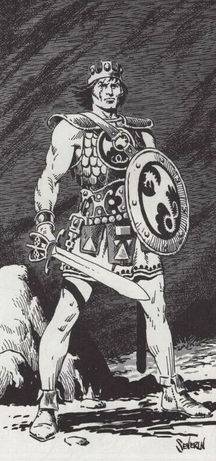 The first time I saw Frank Frazetta's superb painting 'Seven Romans' in an issue of 'Heavy Metal' magazine, I was blown away by it! I had to attempt it, but was shit-scared of trying it with seven figures. Eventually, I painted a single one, but the title 'One Roman' sounded dumb even to my ears. Favourite part: the red of the cape.Medium: gouache, pen and ink.