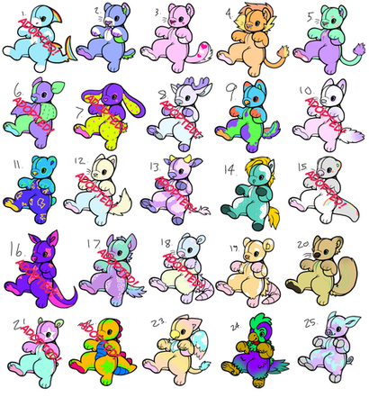 There's Felines, Canines, Dinos, Deer, Cow, Horse/Pony, Bear, Rat, Opossum, Kangaroo, Hyena, Bat, Gryphon, Otter, Shark, Pig, Red panda, Dragon, Manokit and HybridsYellow Capsule - $3 / 100pts