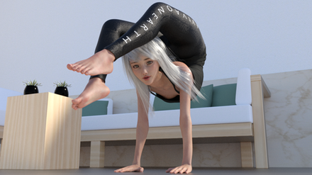 She feels the stretch now, but not enough to satisfy her crazy back breaking newfound sensation of pleasure, so in a last stretch attempt, she pushes herself forward with all the strength of her right leg, and this final pose is what resulted. A beautiful pose, original, and breathtaking
