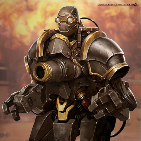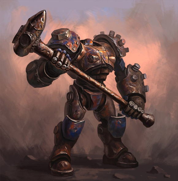 You have come face to face with a hulking giant of a mechanical man, crafted from inter-locking steel plates. Its lantern-eyes are blazing crimson crystals, while its huge armoured hands are like solid steel sledgehammers. On its chest-plate is inscribed one word: JUGGERNAUT. The lumbering metal colossus stomps towards you on pistoning legs as steam boils into the air from the side of its head, where its ears would be if it were a man rather than an iron giant.