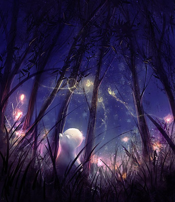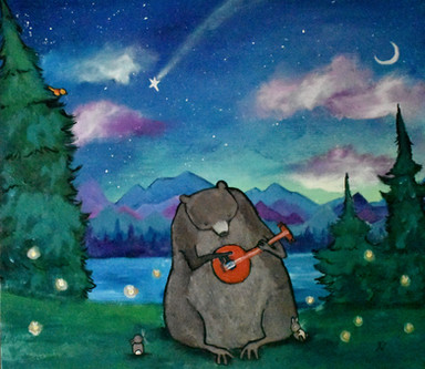 #bear #bunny #fireflies #glow #koifish #magical #nature #pond #summernight #tree #acrylicpainting