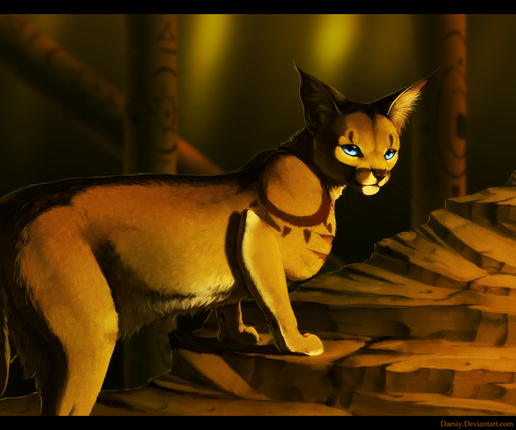 Very nice colour choices! The analogous scheme offers variety in hue, but at the same time, unity across the image. Using the sand drifts / rocks to angle the eye towards the subject was a clever use of the landscape as well. The texture and lighting you put into the environment really gives a strong sense of space and density – I can tell the land on the left of the image is much more solid than the earth and dust-like clouds on the right side. This distinction also makes the feline pop out from the background, which is a nice touch. I like the way you made the foreground details sharper and darker while making the details of objects further away looser and lighter but still representative of shape.