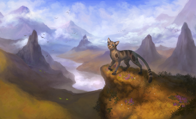 The cat’s head appears to be at an odd angle too. I feel like you intended to have the cat looking out into the distance to emphasize the sensation of vastness in the scenery, but if I follow its gaze, the cat is staring at the ground just before the edge of the image. If the cat is indeed supposed to be looking at the ground, I would have compacted the neck a little bit rather than stretch it.