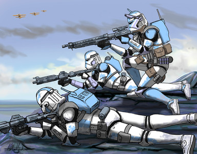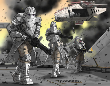 A commando unit making their way to the rally point.Some modded clone armours and weapons.