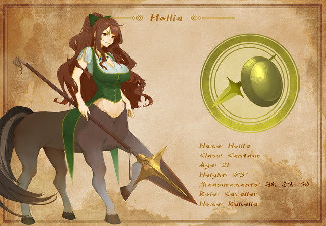 Alexa was born in the fey wilds like any other centaur but was moved to the martial plane at a young age. growing up at one of the farms of the Undercliff Village, she grew up as a hard worker both on the farms and in the towns church. however, she wanted to be a guardsman since she saw them as a noble course. when she came of age she Enrolled in the watch's training program. she had some difficulty during her training due to her size as well as needing a stable to sleep in and live out of. as well as having some difficulty fitting not being a normal Humanoid in but with time she finished basic training and was apprenticed to Dock ward's guard watch.
