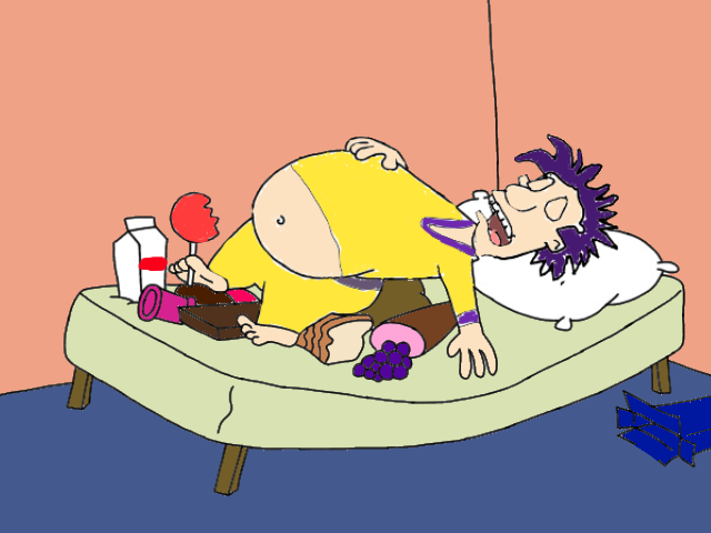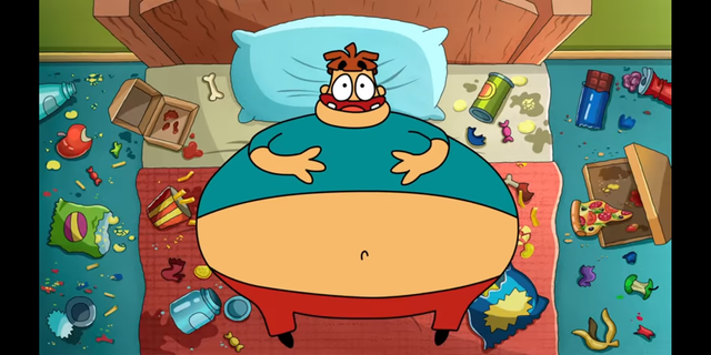 He starts dreaming of him at the contest table (Still in his PJs). The bell has been rung, gaint amounts of food started to zoom in to Arnold, he has no choice but start eating. Anold ate like no other while watching his opponnent eating as well, but Anold's belly is swelling up like a balloon, bigger and bigger. Suddenly some of the food started to come alive and starting to scare hime. Arnold ran off but with his massave weight because of all the food he ate, Anold can't run so fast and slowed him down to a dead end. As the food started to come close to Arnold he heard a voice "Wake Up" and started smelling bad fish only to wake up from his nightmare.