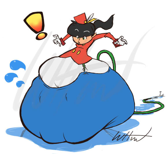 Suddenly without notice, the giant bubble of water coming through the garden hose slowly flowed right into her loose pants and expanded threefold making her slightly difficult to stand back up