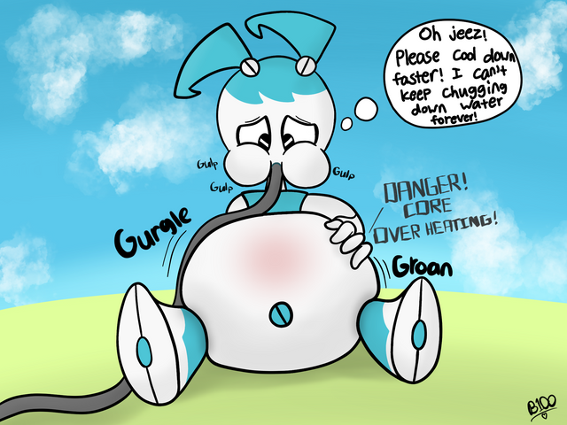 Jenny was stoping the giant water dam at the park leaking by sucking the water with her vacume mouth and then she got rid of the fire at the forest by spraying some of the water inside her water tank body with her fountain arm. After which, Jenny is having trouble what to do with the remaining gallon of water inside her water tank body. Fortunately Tuck had an idea about what to do about Jenny’s water weight problem and how he can enjoy this hot weather.As Jenny said in this picture, she should’ve lost all that water weight if only she’d notice that Tuck secretly plugged a garden hose on Jenny’s back.