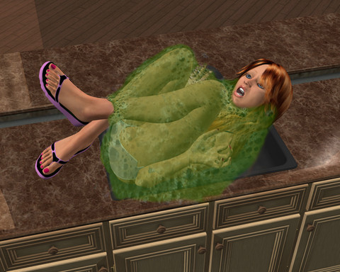 She does not look particularly distressed in this picture, despite being engulfed by a creeping crud monster... I guess she might just be unconscious...
