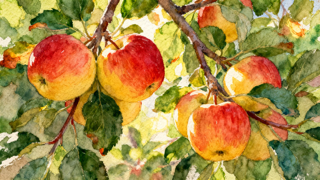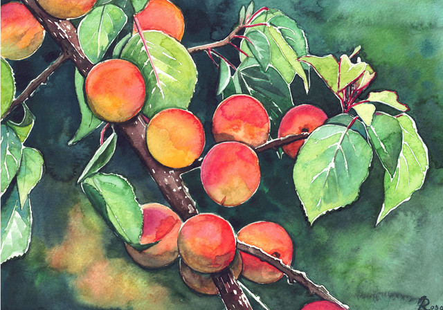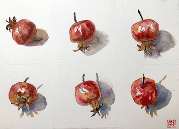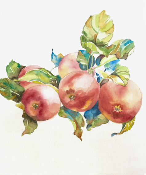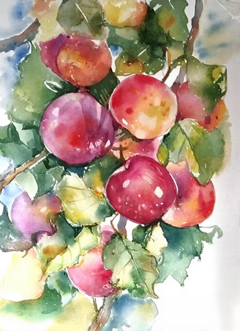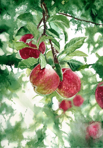World watercolour month, day 27, 'fruits'. I just wanted to have some apples, as they are almost ripe for now, but these ones were too strongly attached to the tree, and I inadvertently plucked the whole branch. I felt sorry about the tree and painted the branch at home, for I didn't want to... waste it.The process looked like that: fav.me/ddcmqub