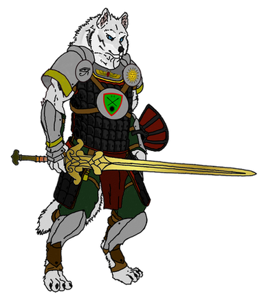 36" Blade; 6" of available grip; golden colored basket hilt able to accept even a large wolfen hand.