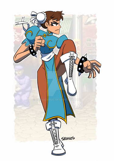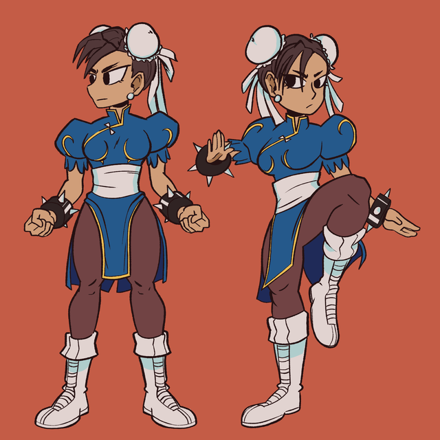 Chun-Li... my favourite character from Street Fighter... I can't remember which number... The game that released on the GBA. Her kicks were awesome, all I had to do was keep pressing the kick button to get through the fights. XD She looks cool and cute in your style.