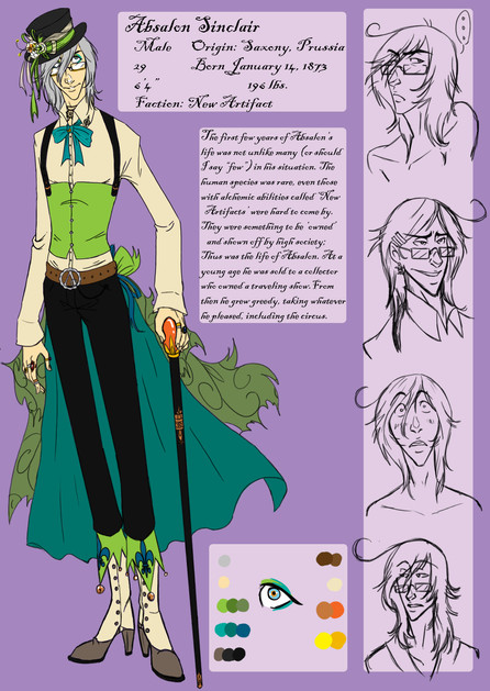 Bio: Gideon is a mysterious, quirky inventor from another era. Everything about him is slanted and weird in one way or another. He had always been curious about the world, testing everything to its limits. Time seemed to be the only thing that escaped his grasp as he realized as life passed him by as he was locked away in his shop. He decided that before anything else, time was something he needed control of; dangerous as it was. It took years of perfecting but with a combination of machinery and magical properties he created a watch that, when wound up, can send the one who holds it backwards and forwards. He, of course, wasted no time exploring the era's, sometimes gathering their technology to examine but he was careful about what he did. The world could fall to pieces if the watch fell into the wrong hands.