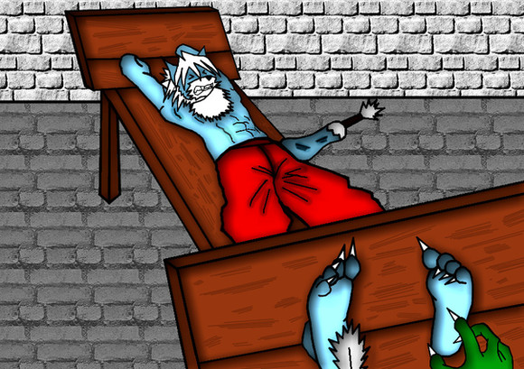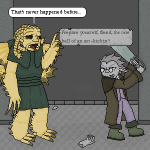 Here's another picture for the 100 pictures thing. Just like for Pain , Alpha doesn't really get weary. Alpha has two states, unconscious/dead and hyperactive-shrew, and he basically between switches them instantly. Instead, I made Thrandûl (which is what I'm calling the Torment Demon) the weary one.As pointed out before, Alpha is not a masochist. Even if he could feel the whipping, it probably wouldn't feel like much more than a massage. But what Alpha can't stand is slackers! Lazy bums...