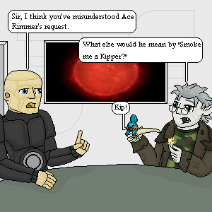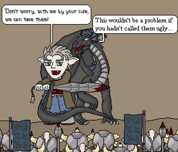 Here's another picture for the 100 pictures thing. For those of you who came in late, I just redrew the picture for this entry. Originally, it was Alpha being carried by smaller and much more boring looking dragon, which I just wasn't that happy with. Also, the dialogue was made inaccurate, since Alair doesn't understand biomechanics and can't Shoop Da Whoop.Of course, now I just wonder what a dragon that size would eat...