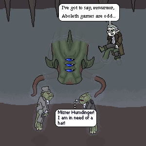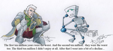 Here's another picture for the 100 pictures thing. And it's a return of the Bugs, last seen in Bugs and Annoyance . And though I may be wrong, I believe that the Bugs are the only thing besides Alpha/Alair that have been drawn in all three styles for the 100 pictures thing.Anyway, the Bug's font has been changed, mainly because I couldn't replicate the old font. Enh, the new font is good enough for me.