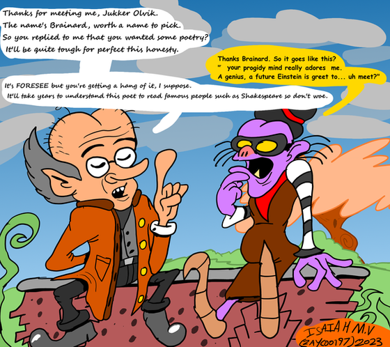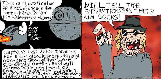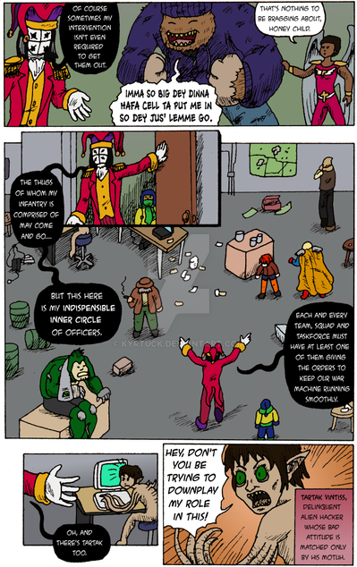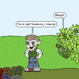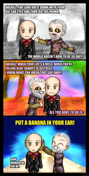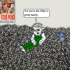 Here's another picture for the 100 pictures thing. Again, the theme didn't quite connect with the actual drawing, but Walt Disney suggests that hallucinations are totally the same as using your imagination.I must admit, I have some rather mixed feelings on this one. On one hand, Alair doesn't look quite right (not so much "Drugged" as "In need of a toilet") and his suit doesn't look quite anachronistic enough. On the other hand, the hallucination turned out pretty well, considering they were just made with MS Paint (except the jet-powered slug, which I may change into something else jet-powered). So, this may or may not pop up into your messages again.